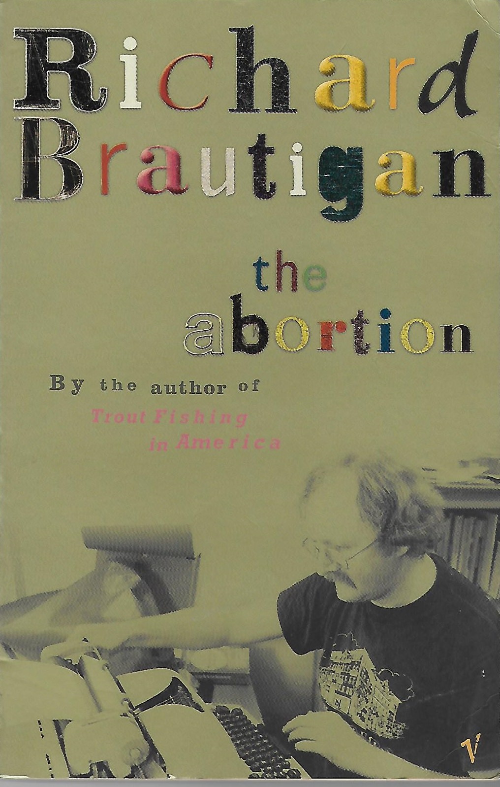 Richard Brautigan has this kind of casual, digressive way of writing that makes you want to follow him. The cover is black and a sort of silver with a multi-colored title and author name but no coffee stain. Oh, and it mentions that he's the author of Trout Fishing in America.